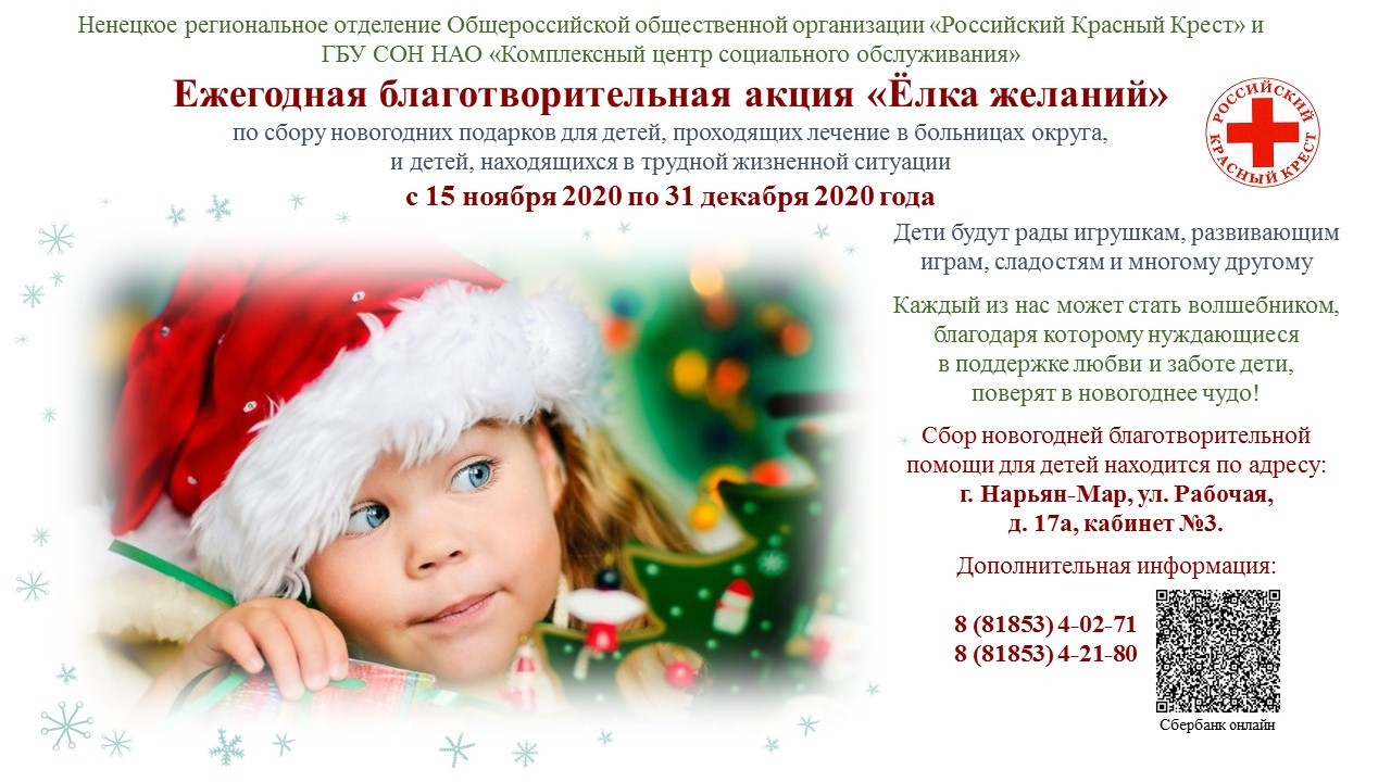 Акция «Ёлка желаний» продлится до конца декабря. Сбор подарков проходит по адресу: Нарьян-Мар, улица Рабочая, дом 17а, кабинет №3. Дистанционно сделать пожертвование можно с помощью QR кода.
