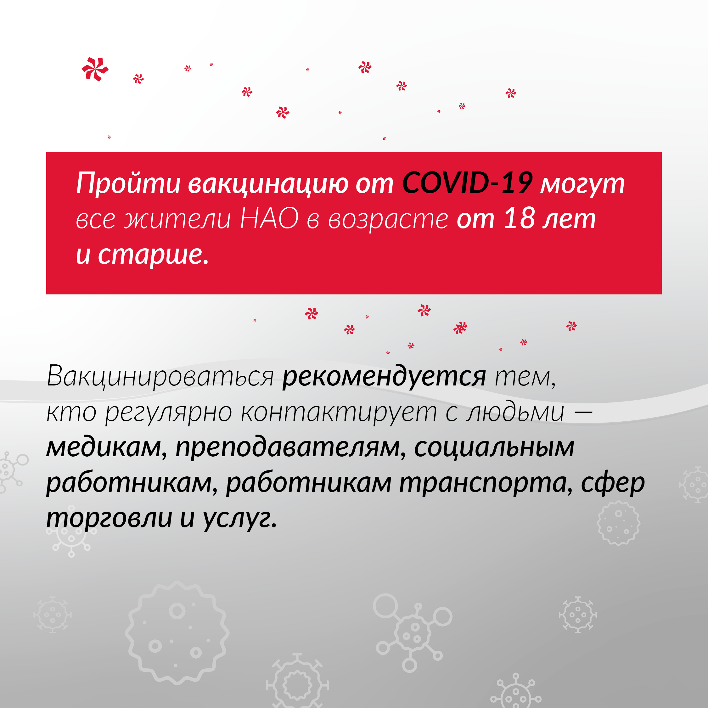 Сегодня пройти вакцинацию от COVID-19 могут все жители НАО в возрасте от 18 лет и старше. В первую очередь вакцинироваться рекомендуется тем, кто регулярно контактирует с людьми – медикам, преподавателям, социальным работникам, работникам транспорта, сфер торговли и услуг. Однако, есть категории граждан, которым вакцина противопоказана.