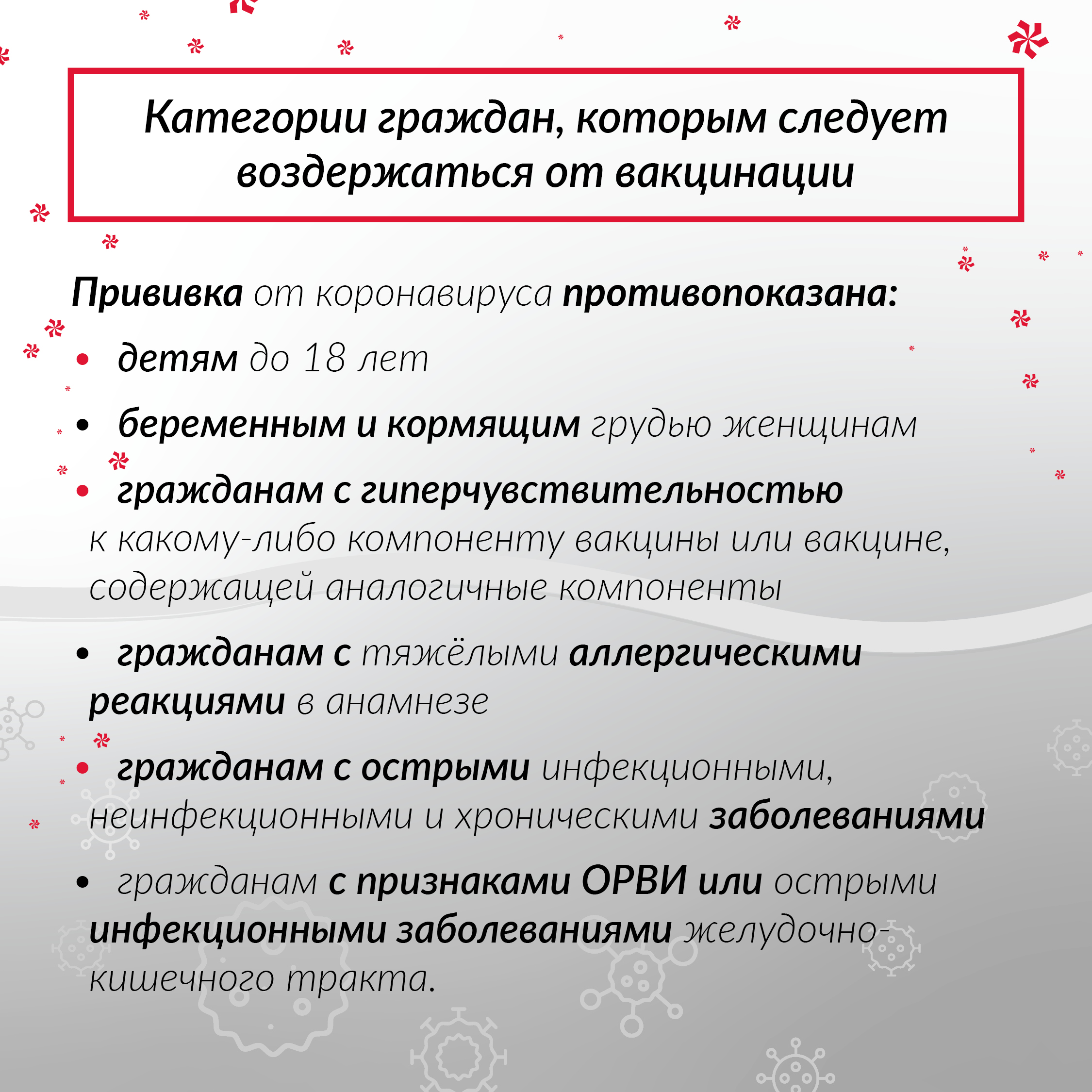 Как сообщили в Департаменте здравоохранения, труда и социальной защиты населения НАО, вакцинация противопоказана детям. В отношении них действует ограничение по возрасту – до 18 лет. Во-вторых, это беременные женщины и кормящие грудью мамы. К тем, кому противопоказана вакцинация, также относятся граждане с гиперчувствительностью к какому-либо компоненту вакцины или вакцине, содержащей аналогичные компоненты, граждане с тяжёлыми аллергическими реакциями в анамнезе, с острыми инфекционными, неинфекционными и хроническими заболеваниями, с признаками ОРВИ или острыми инфекционными заболеваниями желудочно-кишечного тракта.