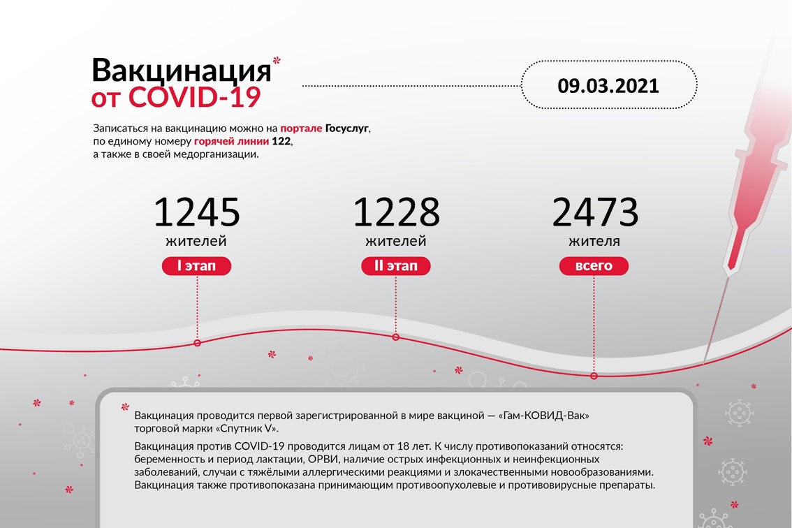 По состоянию на 9 марта прививку от коронавируса в Ненецком автономном округе сделали 2 473 человека. Первый этап вакцинации прошли 1 245 жителей региона, завершили вакцинацию 1 228. Такие данные приводит Департамент здравоохранения, труда и социальной защиты населения НАО.