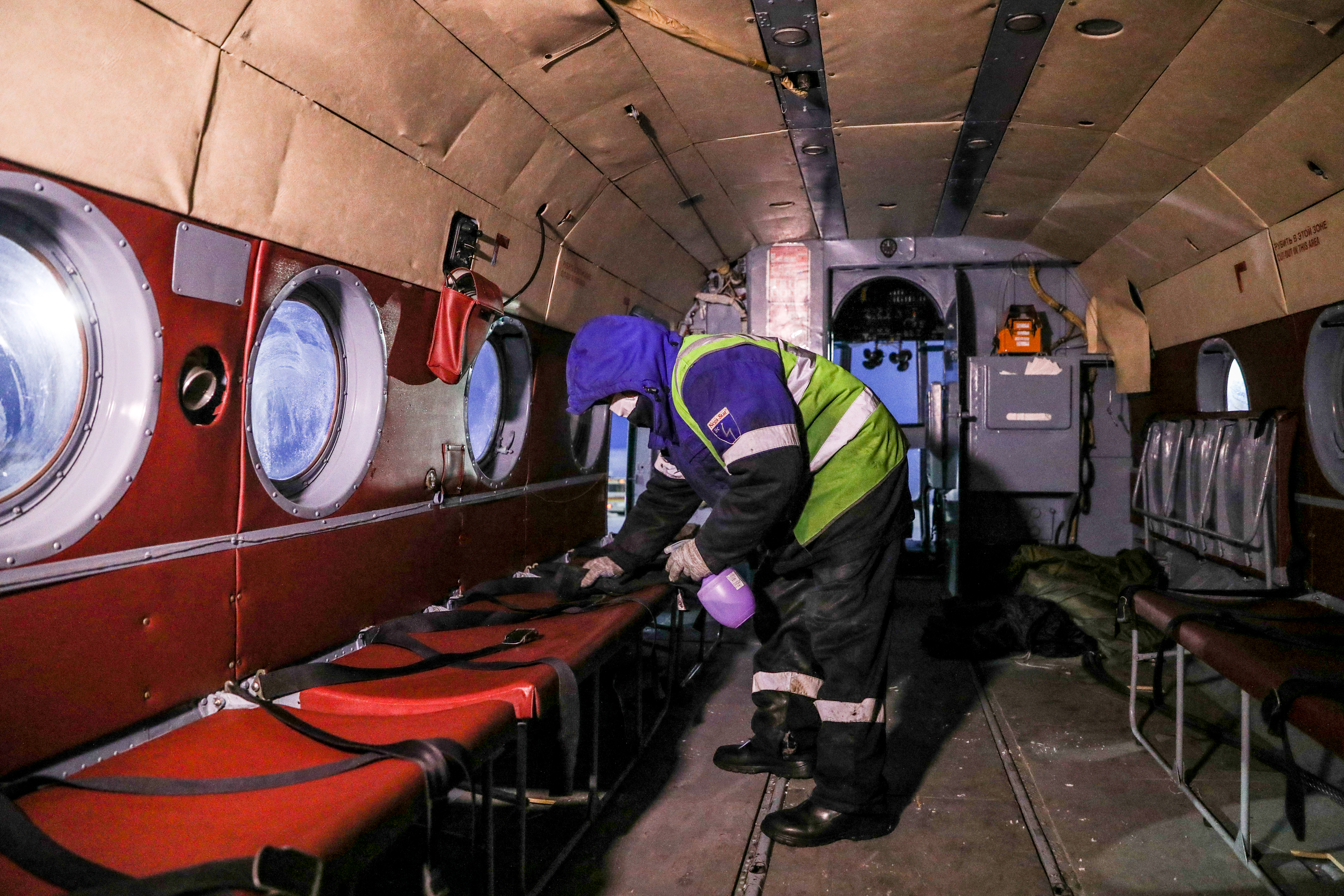 Каждое воздушное судно и автобус, доставляющий к нему пассажиров, дезинфицируют в конце рабочего дня. Требование по комплексной дезинфекционной обработке транспортных средств установлено постановлением губернатора НАО «О режиме повышенной готовности».