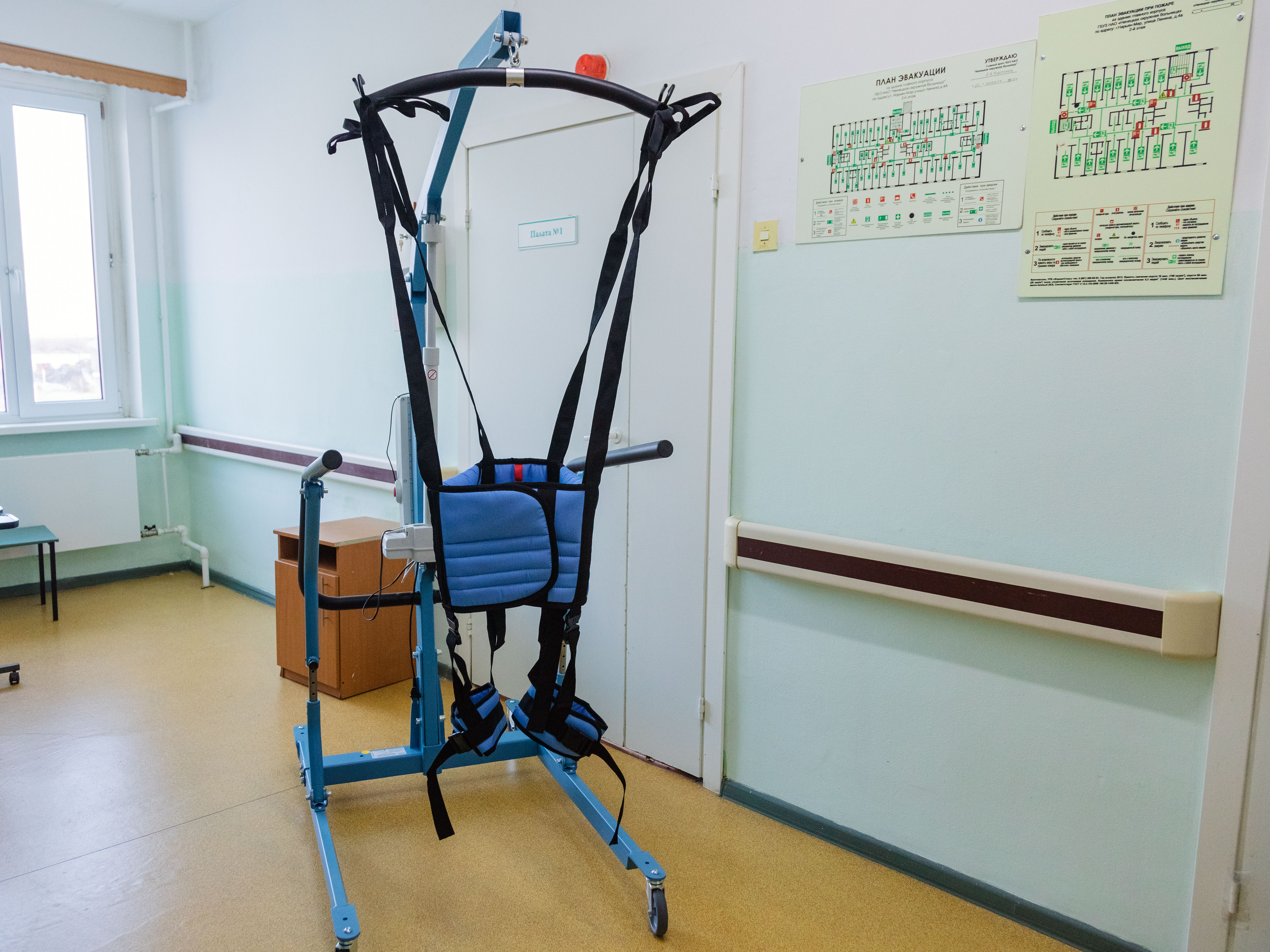 — Универсальная подвесная система применяется для того, чтобы помочь пациенту принять полусидячее положение, разгрузить вес во время ходьбы, а также обеспечить безопасность во время тренировок в вертикальном положении. Подъёмный механизм системы плавно поднимает пациента и помогает восстанавливать навыки ходьбы после серьёзных травм и операций на суставах и позвоночнике, а также после неврологических заболеваний. Такая система значительно облегчает процесс физических упражнений и помогает пациентам встать на ноги, — пояснил заведующий первичным сосудистым отделением Ненецкой окружной больницы Александр Берляков.