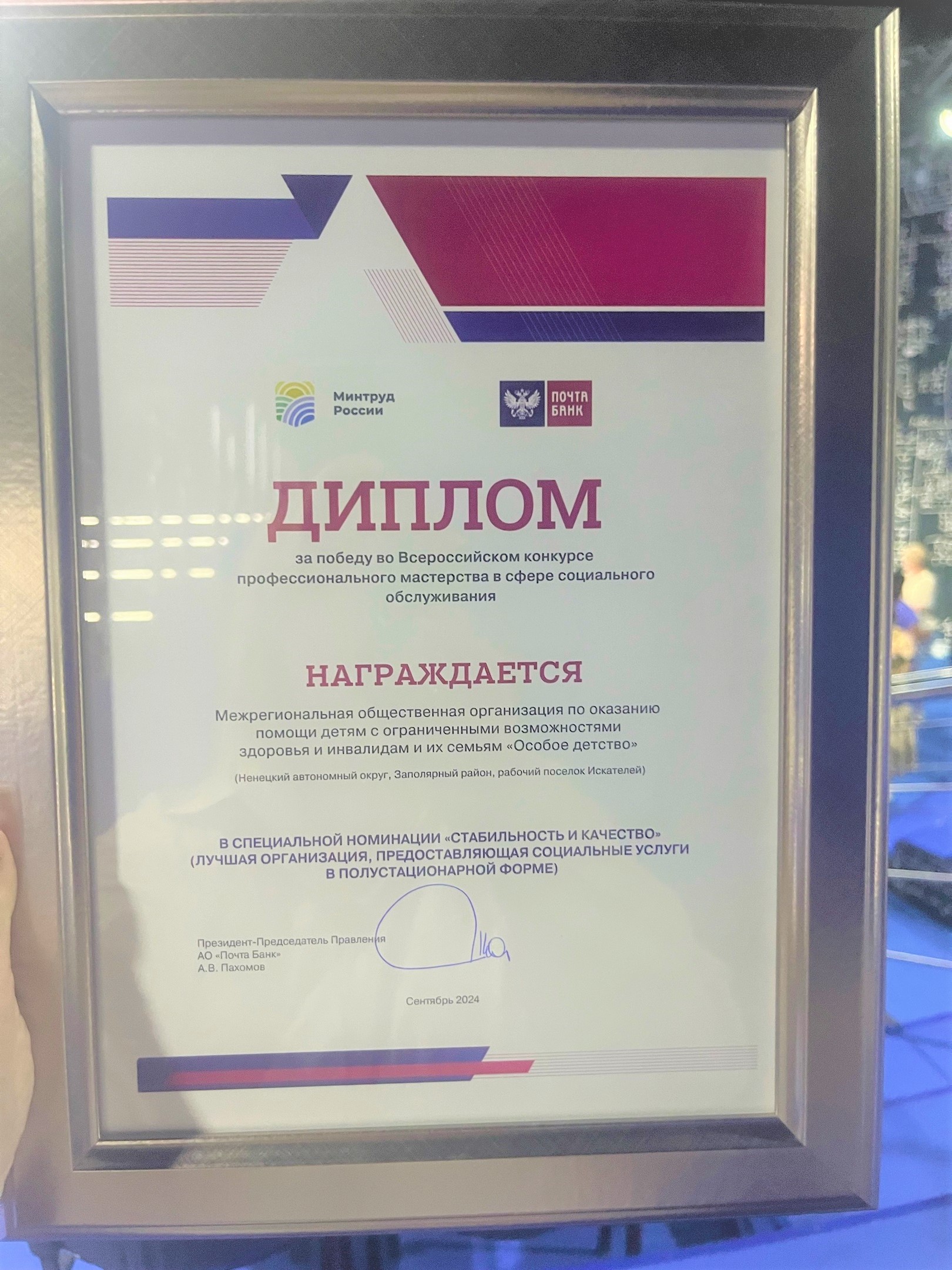 Межрегиональная общественная организация по оказанию помощи детям с ограниченными возможностями здоровья и инвалидам и их семьям «Особое детство» стала победителем в специальной номинации «Стабильность и качество» социального партнёра Минтруда России АО «Почта Банк» как лучшая организация, предоставляющая социальные услуги в полустационарной форме.