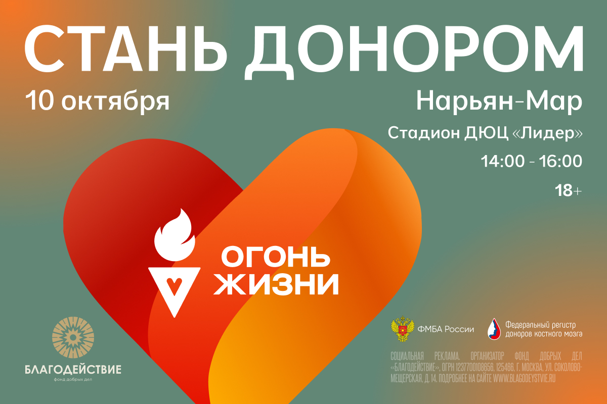 В пятницу, 10 октября, в Нарьян-Маре состоятся мероприятия второго этапа Всероссийской эстафеты факела «Огонь жизни». Цель эстафеты – привлечь новых доноров в Федеральный регистр доноров костного мозга, чтобы увеличить шансы на спасение пациентов с лейкемией и другими тяжёлыми заболеваниями.